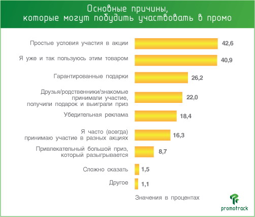 Основные мотивы к участию в промо-акциях – простые условия участия и запланированная покупка. Гарантированные подарки являются основным стимулом для 26,2%, а розыгрыш дорогих призов мотивирует к участию только 8,7%.