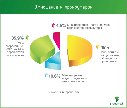 Интересными оказались и результаты опроса, касающегося отношения к промоутерам. Оказалось, что почти половине всех респондентов приятно, когда к ним обращаются промоутеры, 35,9% - все равно, 4,5% - неприятно. Но вместе с тем, почти каждый десятый отметил, что ему неприятно, когда промоутеры его игнорируют!