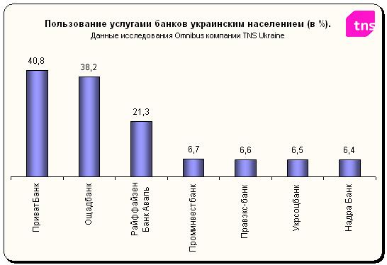 В апреле 2007 года в рамках проекта Omnibus компания TNS Ukraine провела исследование пользования услугами банков и уровня удовлетворённости украинцами сотрудничеством с банками. Опрошенным предлагалось оценить свою удовлетворённость сотрудничеством с банками, услугами которых они пользуются, по семибальной шкале, где значение «1» соответствует ответу «абсолютно не доволен», а «7» – «абсолютно доволен». Полученные оценки были объединены в категории «не удовлетворён» (оценки от «1» до «3»), «нейтральное отношение» (оценка «4») и «удовлетворён» (оценки от «5» до «7»).