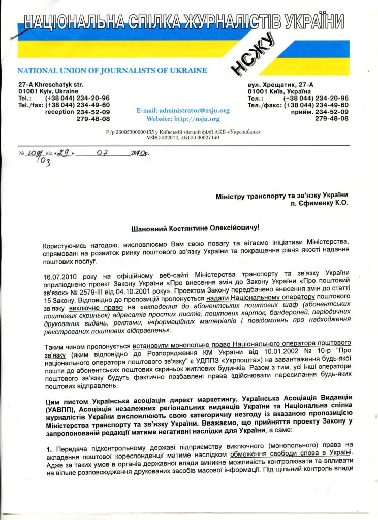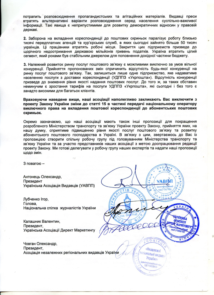 Национальный Союз Журналистов Украины (НСЖУ), Украинская ассоциация издателей периодической прессы (УАИПП), Украинская ассоциация директ маркетинга (УАДМ), Ассоциация независимых издателей Украины (АНРИУ) выступили против монополизации доставки Укрпочтой: