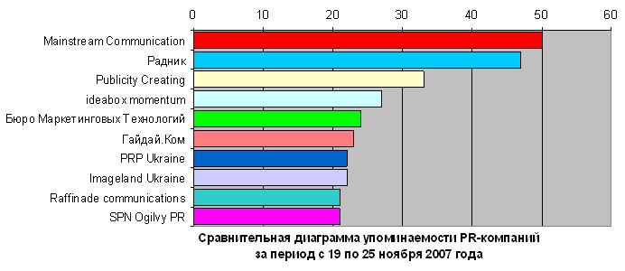 В течение недели, с 19 по 25 ноября 2007 года, системой автоматического мониторинга новостей InfoStream (www.infostream.ua) было проанализировано 282074 публикации на украинском и русском языках из более чем 3000 СМИ, представленных в Интернет. В перечень наиболее активных интернет-СМИ, разместивших четыре и более публикаций с упоминанием анализируемых компаний, вошло двенадцать интернет-изданий: ProPR, Publicity, "МЕТА - Украина. Пресс-релизы", "Телекритика", UKRBIZ.NET, "Рекламастер", PROMOmix, InThePress.ru, "PR-центр Ефективні комунікації", "PR - это жизнь", "Зеркало Рекламы" и МАМИ.