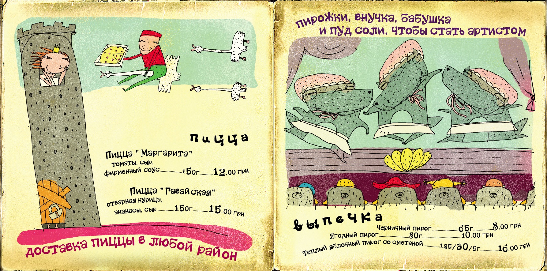 Созданное в виде детской книги, меню интересно не только рассматривать, но и читать подписи к иллюстрациям. Каждая картинка отображает узнаваемых героев из известных всем сказок, иногда в непривычных и комичных ситуациях. Баба-Яга, например, вошла во вкус современной жизни, Царевна-Лягушка встречает принца не просто со стрелой, а с нанизанным на стрелу шашлыком, так как путь к сердцу принца лежит через желудок. Колобок нашел не только родственную душу, но и родственное тело в виде снежной бабы, а сытый Карабас-Барабас больше не бьет, а заботливо укрывает своей бородой милых кукол.