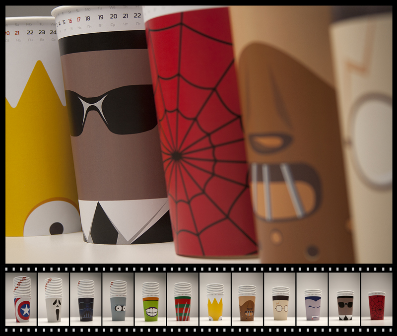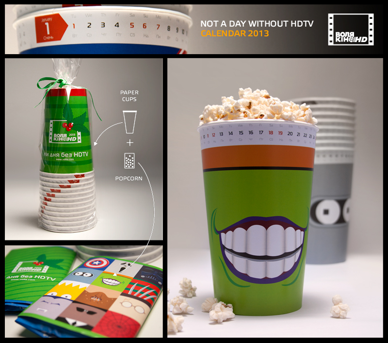 Креативное агентство Scholz & Friends Kyiv разработало календарь для партнеров компании «Воля» в виде набора картонных стаканов, напоминающих о любимых кинофильмах. Пакет с поп-корном шел в комплекте.