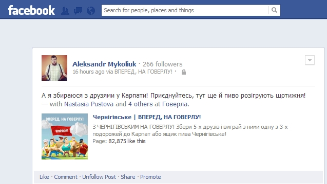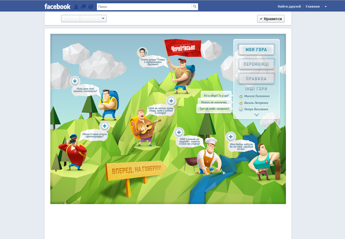 Агентство Prodigi запустило новое приложение для странички ТМ “Чернігівське” в Facebook. “Вперед, на Говерлу!” позволяет собрать команду для похода на самую известную и высокую гору в Украине. Из своих друзей нужно выбрать типичных персонажей: повара, фотографа, силача, душу компании и ворчуна. После того, как все участники дадут согласие, команда получает шанс выиграть одну из трех групповых поездок на Говерлу.