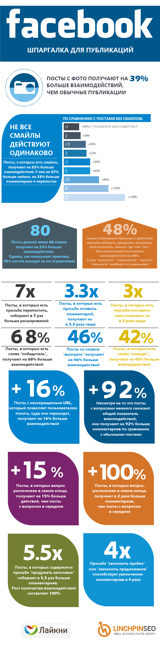 Далеко не все посты в Facebook набирают одинаковое количество лайков и расшариваний. Причина кроется не только в их содержании, но и в форме публикаций - длина текста, наличие фото или ссылки, обращения, вопроса к пользователям. Компания Buddy Media проанализировала около 2 тысяч брендовых страниц и выбрала самые верные способы повысить количество лайков, комментариев и перепостов.