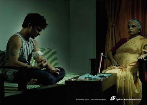 Euro RSCG, создавая эту социальную кампанию для ассоциации Eye Bank Association of India, сообщает нам, что слепота затрагивает не только слепых людей, и подкрепляет это несколькими красноречивыми плакатами