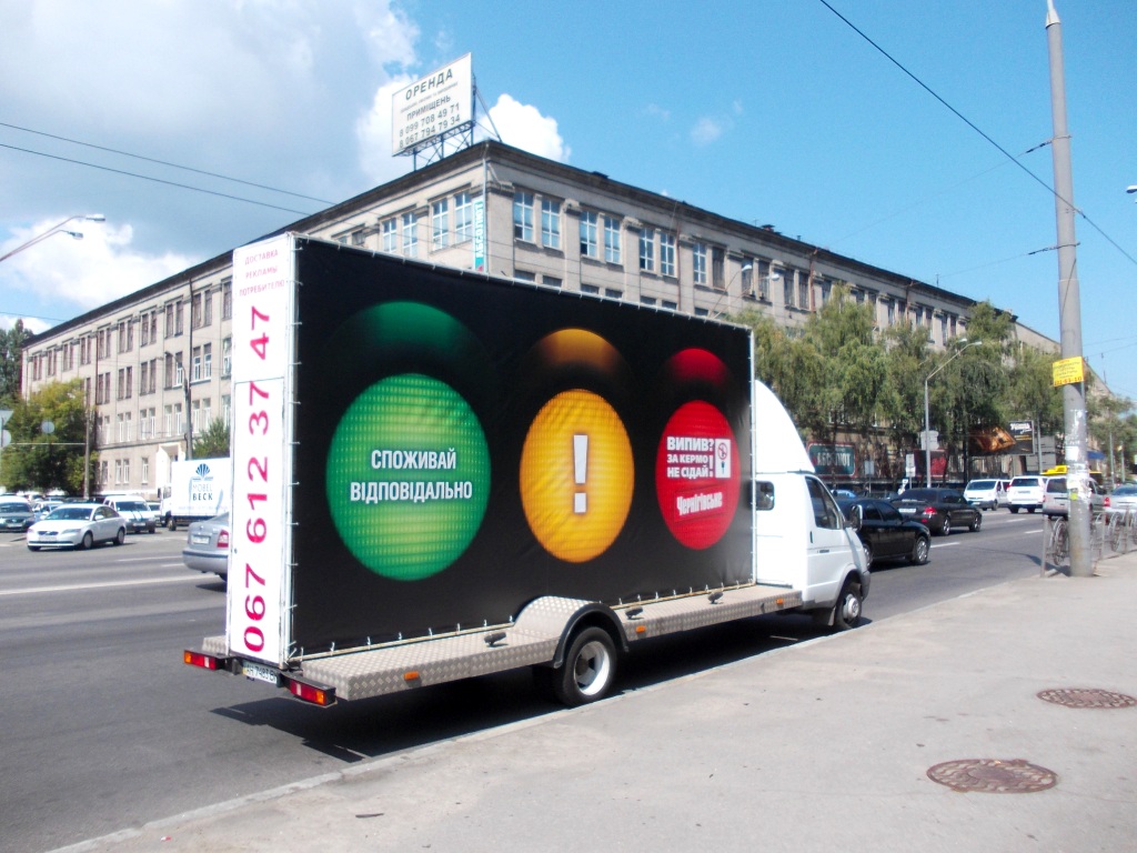 В 7ми города-миллионниках на смену эвакуаторам с разбитыми автомобилями пришли Брендмобили. На них изображена коммуникация проекта в новой интерпретации. В качестве визуализации был выбран простой и понятный образ светофора, который предупреждает «Випив? За кермо не сідай!» и напоминает о важности ответственного потребления алкоголя. Хоть сам инструмент является достаточно стандартным, он на 100% оправдан работой в местах с высокой концентрацией ЦА.