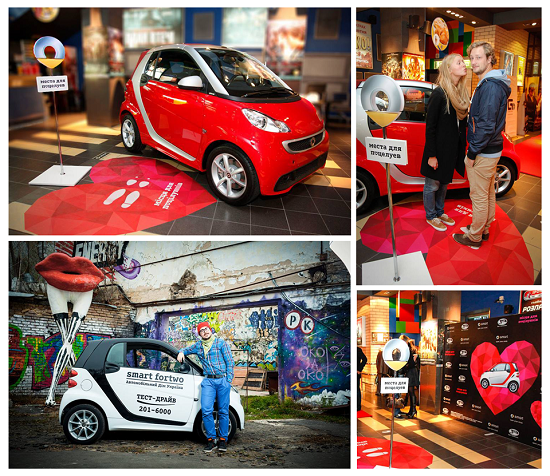 Агентство обеспечило широкую digital и offline-поддержку: во время кампании задействовали рекламу перед фильмом, на ЖК-экранах в кинотеатре, на билетах, наружную рекламу; брендировали «места для поцелуев» в кинозале и вебсайт кинотеатра; разыграли билеты на страницах бренда и кинотеатра в социальных сетях; привлекли знаменитостей и СМИ во время премьер… и попали на ТВ, не заплатив за это ни копейки! А чтобы подчеркнуть одно из преимуществ smart fortwo, а именно компактность и возможность припарковаться в самых невероятных местах (таких, как дверной проём кинотеатра!), мы припарковали его прямо в холле здания!