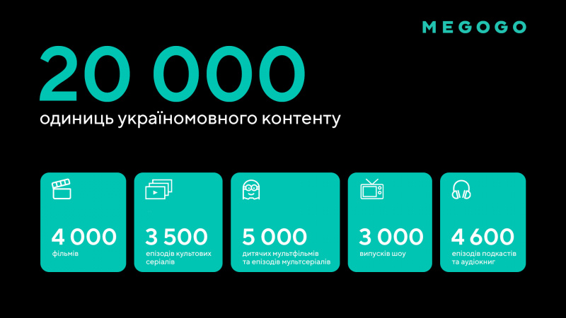 На MEGOGO на украинском языке около 4000 фильмов, 3500 эпизодов культовых сериалов, 5000 детских мультфильмов и эпизодов мультсериалов, более 3000 выпусков шоу и более 4600 эпизодов подкастов и аудиокниг. Кроме того, еще более 12 000 единиц контента имеют украинские субтитры.