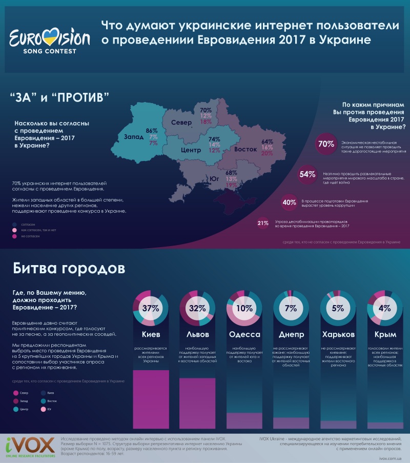 Больше о том, как интернет пользователи из разных регионов относятся к проведению Евровидения в Украине, а так же какому из пяти крупнейших городов доверили бы проведение конкурса, смотрите Исследование проведено методом онлайн интервью с использованием панели iVOX. Размер выборки N = 1075 респондентов. Структура выборки репрезентативна интернет населению Украины (кроме Крыма) по полу, возрасту, размеру населенного пункта и региону проживания. Возраст респондентов: 16-59 лет.в инфографике.