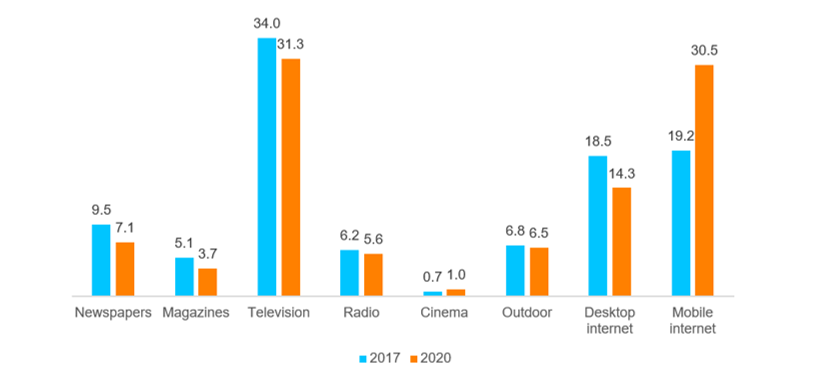 Так как пользователи переключаются с настольных компьютеров на мобильные устройства, а новые пользователи переходят сразу на мобильные устройства, реклама повторяет те же тенденции. Мобильная реклама стремительно растет и забирает долю у других медиа. В 2017 году ее доля выросла на 35% и мы ожидаем, что к 2020 году прирост будет составлять 21% ежегодно.