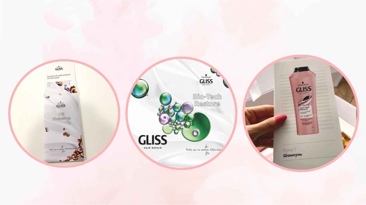 Протягом кількох днів блогери користувалися засобами для волосся, додаючи щоразу новий продукт. Серед форматів контенту, що були застосовані під час рекламної кампанії: цикл сторіз з розпакуванням подарункового боксу, сторіз про переваги комплексного догляду за волоссям, а також фотопости про перезапуск бренду та оновлення лінійок продукції бренду GLISS.