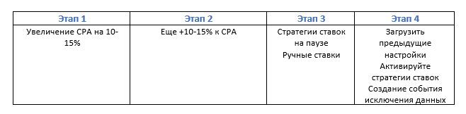 - Повысьте CPA снова, когда приближаетесь к периоду большого пика.