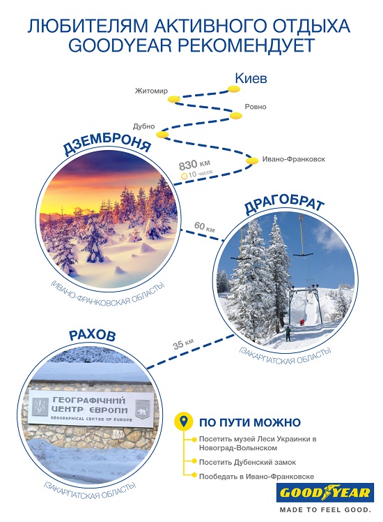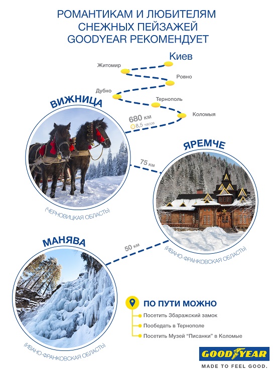 Тем более, что в Украине есть масса мест и для активного зимнего отдыха, и для романтического уикенда. Компания Goodyear предлагает вам несколько интересных вариантов, где можно провести выходные и куда легко добраться на автомобиле.